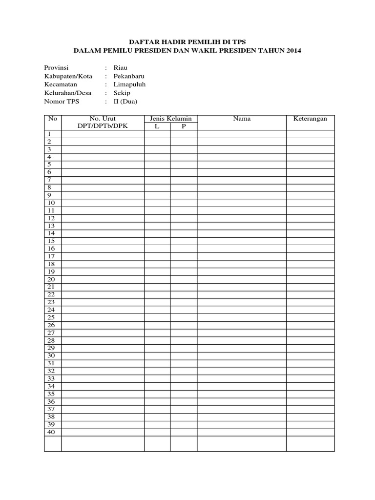 Daftar Hadir Pemilih Di Tps from imgv2-1-f.scribdassets.com Tapi saya akan bagikan kebanyakan orang yang sering menggunakan form absensi pada saat rapat yang pernah saya ikuti. Jurusan teknik sipil last modified by: Bagi yang ingin mendownload contoh surat/arsip surat/format daftar hadir diatas dalam bentuk excel silahkan ambil di google drive dibawah ini, atau klik download di bawah tampilan surat. Daftar hadir manual nama : Jun 25, 2021 · baik, pada postingan ini saya akan membahas tentang format daftar hadir untuk perangkat desa, siapa tau pembaca blog ini ada yang bekerja sebagai perangkat desa atau mungkin sedang belajar komputer dan ingin berlatih membuat berbagai format dokumen yang dibutuhkan khususnya di desa. Jul 07, 2021 · sahabat guru, didalam postingan ini kami akan sajikan format daftar hadir siswa (xls) yang bisa digunakan sebagai dokumen/buku catatan kehadiran siswa dikelas tahun ajaran 2021/2022 mengingat tahun ajaran baru akan segera dimulai, maka kegiatan yang pertama sekali akan dilaksanakan adalah masa pengenalan lingkungan sekolah (mpls) akan. Yang terpenting ada tanda tangan nya saja. A short summary of this paper.