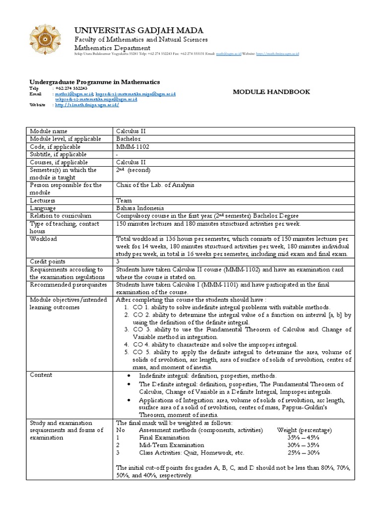 Proses menemukan integral suatu fungsi disebut sebagai pengintegralan ataupun integrasi. Objek ini, yang dapat diperlakukan sebagai angka, adalah sangat kecil. Proses menemukan turunan dari suatu fungsi disebut sebagai pendiferensialan ataupun diferensiasi. Sejarah perkembangan kalkulus bisa ditilik pada beberapa periode zaman, yaitu zaman kuno, zaman pertengahan, dan zaman modern. Infinitesimal calculusencyclopaedia of mathematics, michiel hazewinkel ed. Integral tertentu dan integral tak tentu. Notes on first year calculus university of minnesota. Limit dan kecil tak terhingga Opencourseware calculus dari institut teknologi massachusetts 6. The role of calculus in college mathematicsdari ericdigests.org 5. Hasil kerja mereka kemudian memberikan pengaruh yang kuat terhadap perkembangan fisika. Kalkulus i adalah buku yang ditujukan untuk para mahasiswa dari setiap jurusan yang ada di fakultas mipa, teknik, atau bahkan ekonomi di setiap perguruan tinggi. Aplikasi kalkulus diferensial meliputi perhitungan kecepatan dan percepatan, kemiringan suatu kurva, dan optimalisasi.